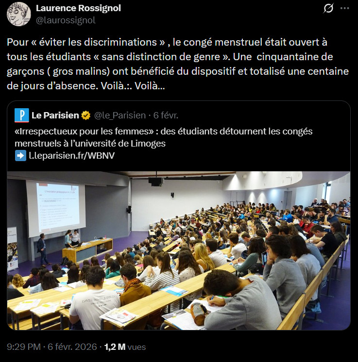 Les faits concernent le dispositif de congé menstruel mis en place à l’Université de Limoges à partir d’octobre 2025. Ce dispositif n’est pas populaire en France : à de nombreuses reprises, des intervenants conservateurs ont fait savoir tout le mal qu’ils pensaient de l’incorporation de jours de congé ou d’autres formes d’intervention publique (par exemple, la mise à disposition de protections périodiques gratuites) visant à apporter du soutien pendant les règles. Pourtant, le problème n’est pas mineur : selon les sources, au moins une personne concernée sur deux, en grande majorité des femmes cis, mais aussi des hommes trans et personnes non-binaires, et jusqu’à neuf sur dix, se plaint de souffrir de douleurs pendant les règles. Selon le ministère de la santé, une personne ayant ses règles sur dix (là encore, majoritairement des femmes cis) souffre d’endométriose, une maladie inflammatoire conduisant fréquemment à des douleurs fortes. Dans un tel contexte, et face à l’absence d’action de la part de l’Etat, des établissements universitaires mettent en place des congés menstruels depuis 2023.